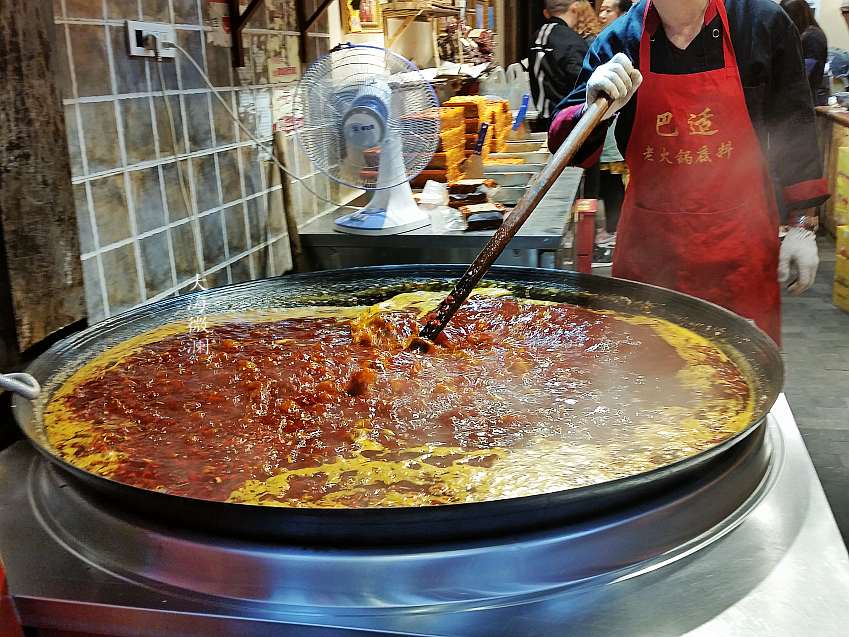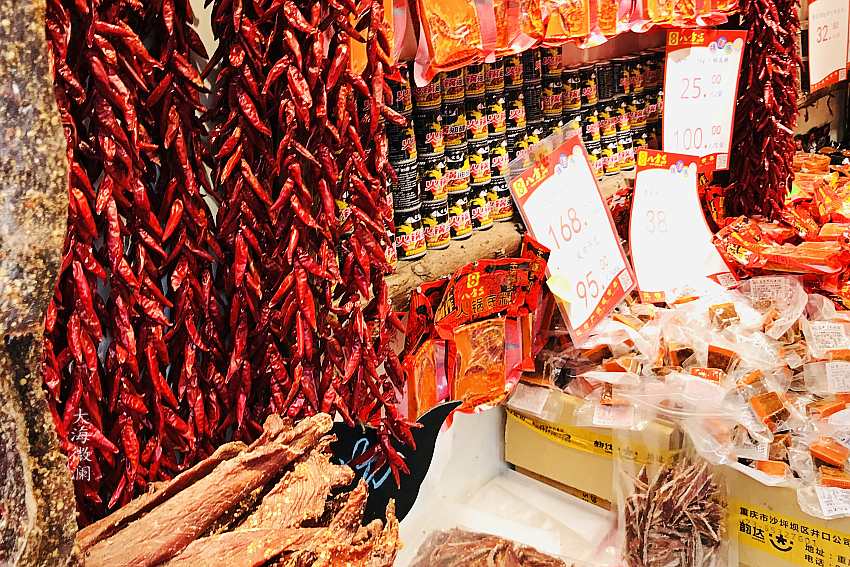 重庆第一站——磁器口,第一次来到磁器口,想象不到,这里简直就是人山人海,没有选择,一路顺着人流前行,对这个古镇几乎没有太完整的概念,我们是在人海中顺流而下,空气中都弥漫着麻辣香味,到处都是熬制辣椒的大锅,火锅的各种底料、配料、辣椒制品甚至辣椒真是应有尽有,感觉这个美食之都会把整个世界都放进火锅里。还有各种小吃琳琅满目,都不知道该品尝啥了。