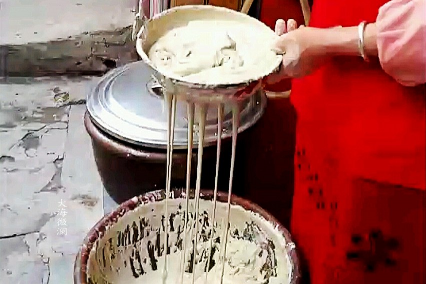 我们被这个吆喝声所吸引,看着这样漏粉还真是垂涎,在这里我们品尝了第一碗麻辣豆粉,要了一碗辣、一碗不辣的,没加辣子真就没有重庆味道了,有辣子的才正宗,不过,真心太辣了,辣的直咳嗽。