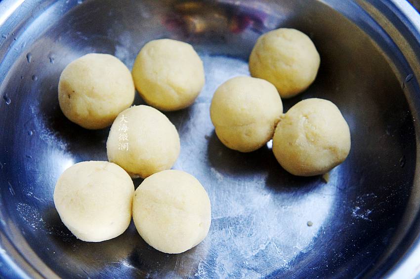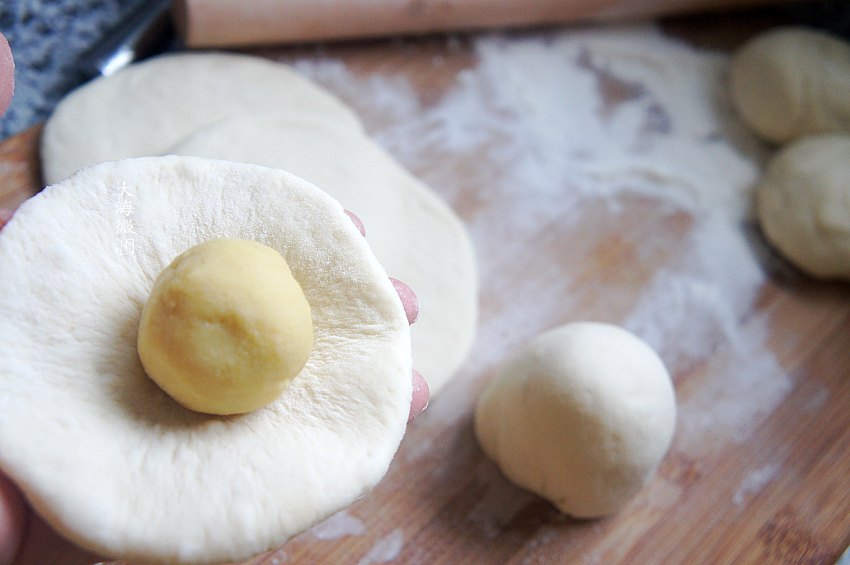 5、每个面团揉匀,擀成薄饼,包上豆沙馅滚圆;