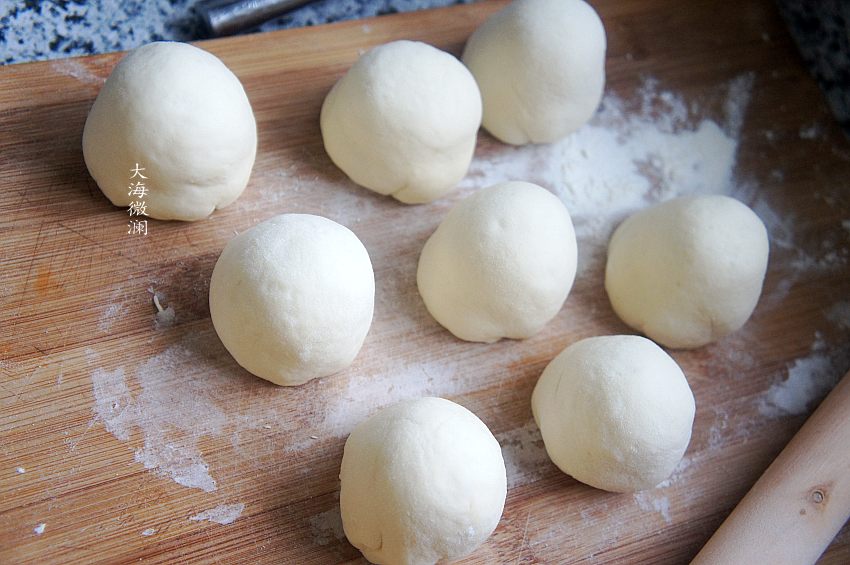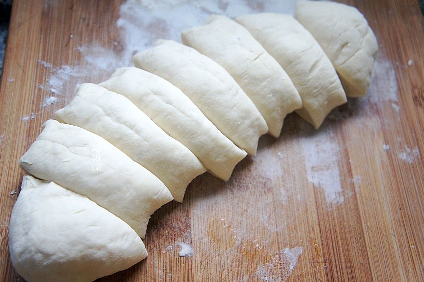 4、将饧好的面团揉成长条,分成大小均匀的8个小面团;