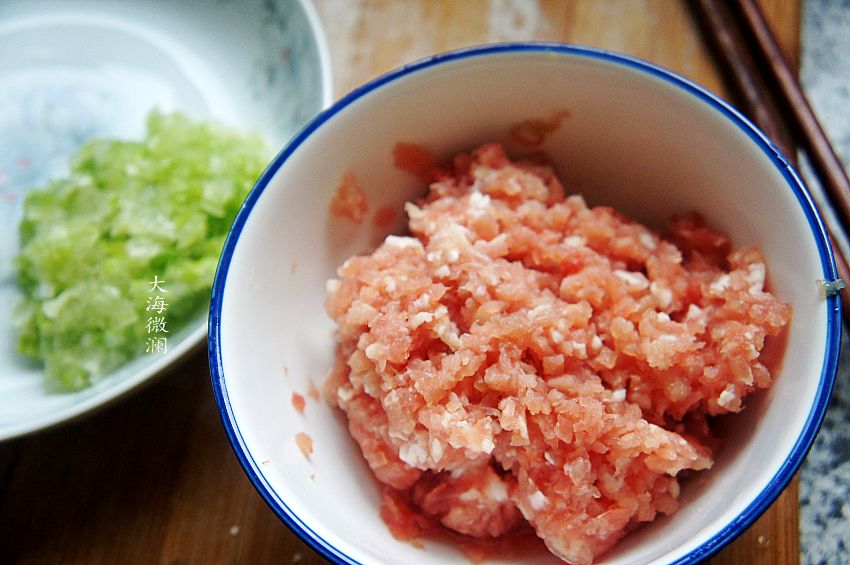 2、猪肉洗净,切碎,剁成肉末,葱去皮洗净切碎;
