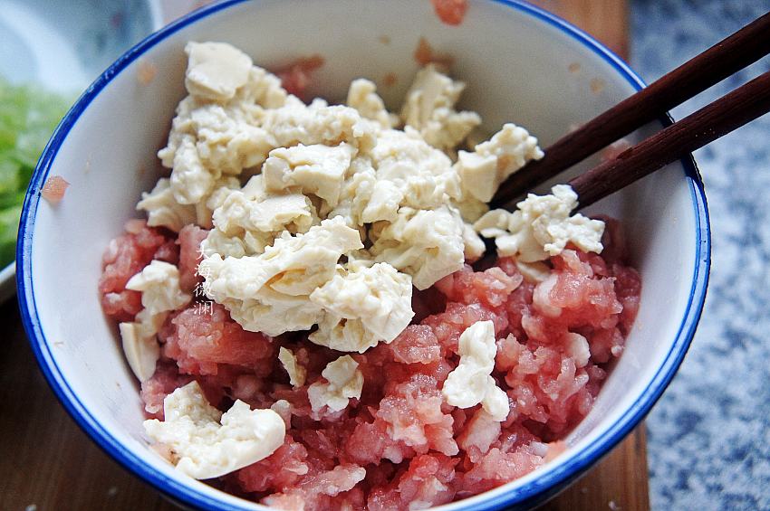 3、肉末中加入葱、盐、料酒、生抽、胡椒粉搅拌均匀,再加入豆腐碎换个大盆搅拌均匀;