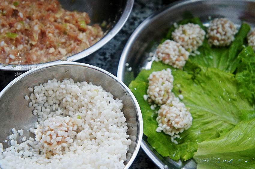 6、挤一小团肉馅在浸泡好的糯米里,轻轻的晃动碗,让肉丸子均匀的裹上一层糯米,蒸屉铺上生菜叶,然后将做好的珍珠丸子码入蒸屉;