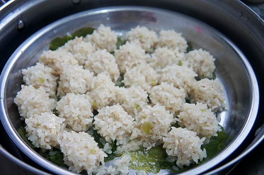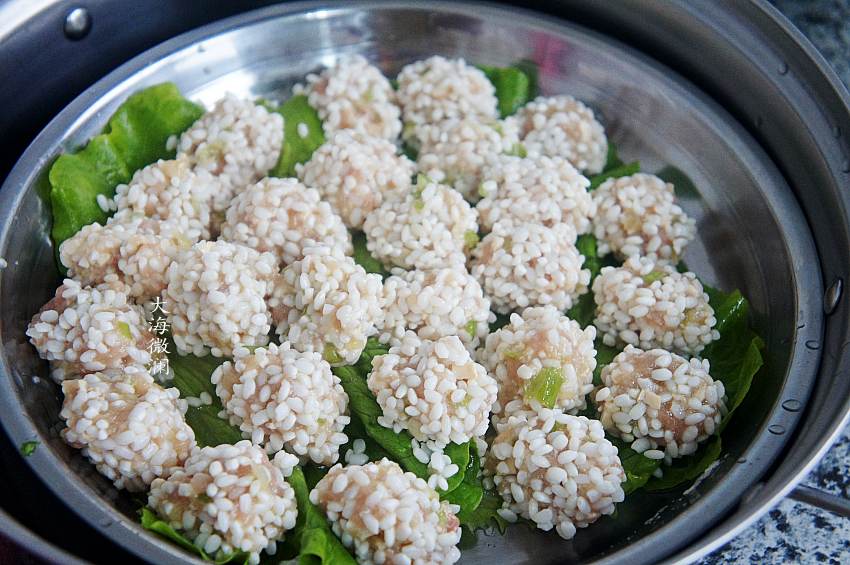 7、所有的珍珠丸子都做好,锅中加入适量的水,隔水蒸15~20分钟左右;