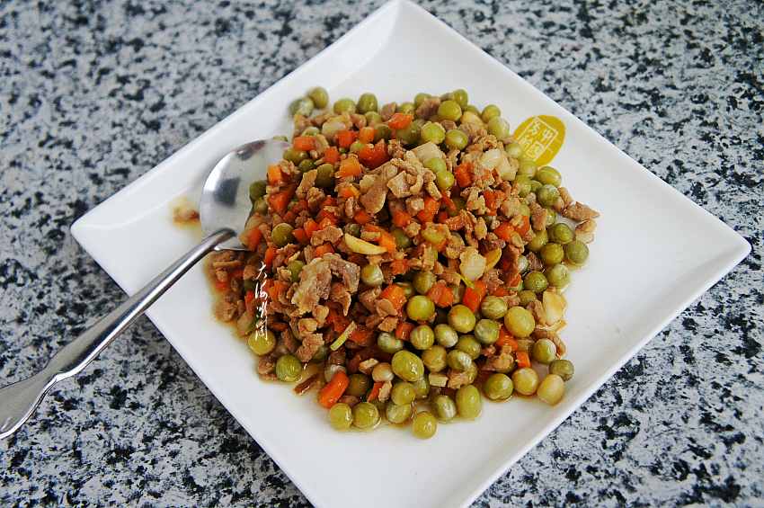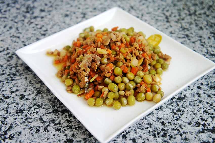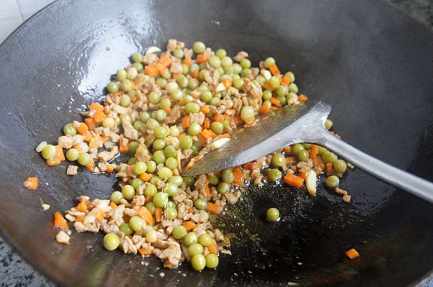 7、加入煮熟的豌豆翻炒,加入盐、胡椒粉调味;