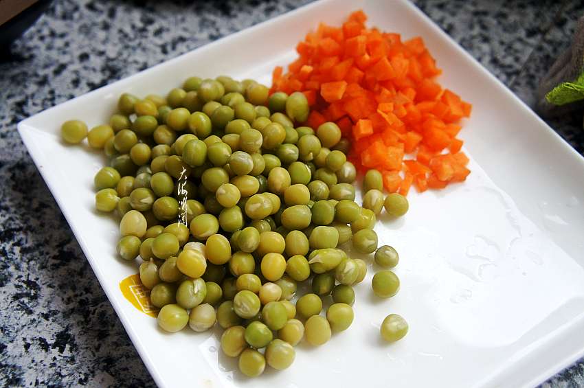 3、捞出煮熟的豌豆控净水分备用。胡萝卜去皮洗净,切丁;