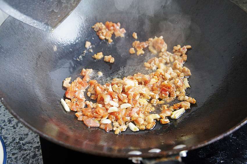 5、炒锅加入适量的油,爆香五香粉和葱花,加入肉丁翻炒;