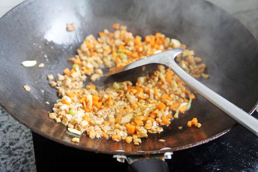 6、加入胡萝卜丁翻炒;