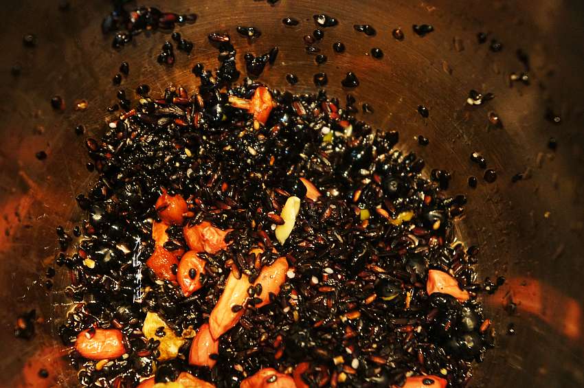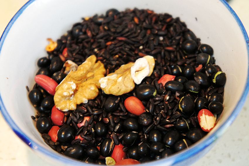 其中含有黑豆、黑米、黑芝麻、花生、核桃,而且都是焙熟的食材,做成早餐羹有股子特别的香味。