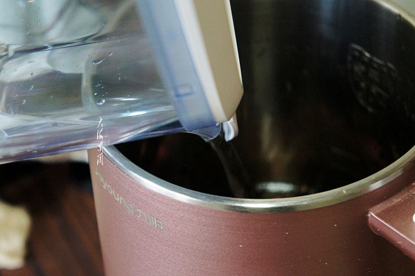 加入过滤的纯净水,根据家中人数可加到豆浆机的中档水位或者最高水位。