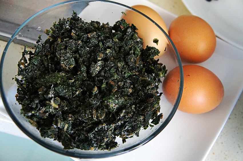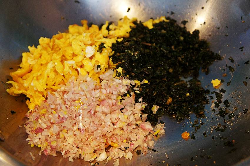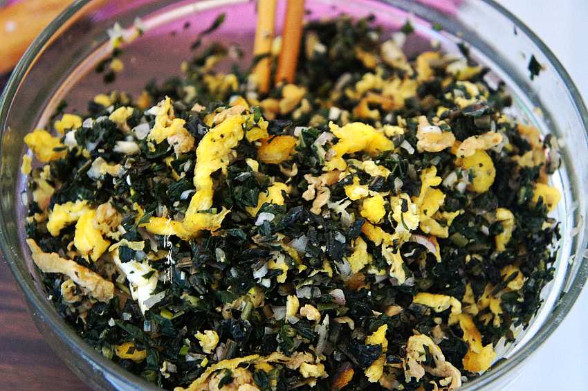 4、毛葱去皮洗净切碎,用毛葱比用大葱更香,将毛葱碎和婆婆丁碎直接放入锅中(懒人的做法),加入盐、五香粉、蘑菇粉、胡椒粉、少许耗油搅拌均匀。