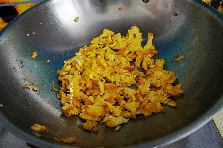 3、鸡蛋打散,搅拌均匀,炒锅加入适量多一点油,拌馅时不用另加油了,油开倒入蛋液,迅速用筷子搅拌,越碎越好,鸡蛋煎熟关火晾凉。