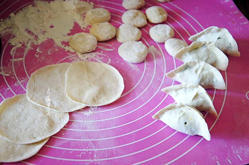 6、包饺子,面团揉成长条,切成均匀的小面剂子,擀成饺子皮,包上馅两手对捏就好了,非常简单人人都会包。