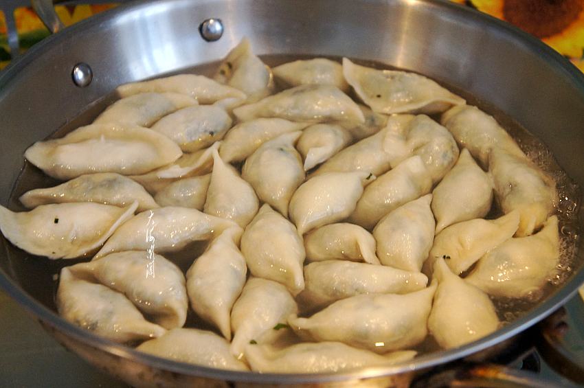 2、煮饺子,水开后饺子入锅,第一次翻开后点入冷水,第二次翻开再次点入冷水,第三次翻开即可出锅,饺子煮的恰到好处。