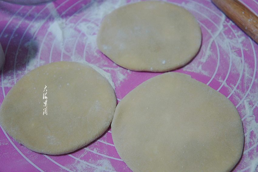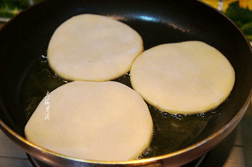 6、平底锅中加入适量的植物油,做好的糖饼入锅小火烙。