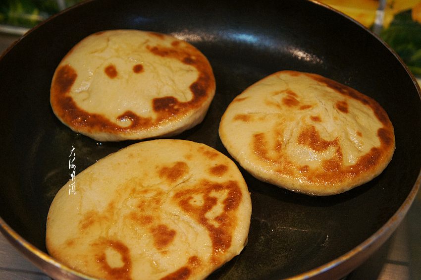 7、翻面烙,饼鼓起来就烙熟了,可以出锅啦。
