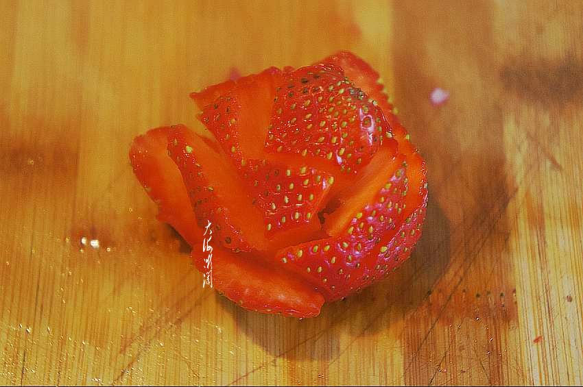 4、草莓切成玫瑰花,用水果刀从草莓的底部错位切片直到顶部,整理一下就成玫瑰花的造型,同样的方法做4朵玫瑰花。