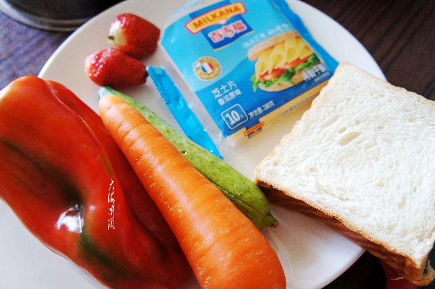 【萌娃三明治】所需食材:吐司面包2片;芝士2片;草莓5个;彩椒适量;黄瓜适量。