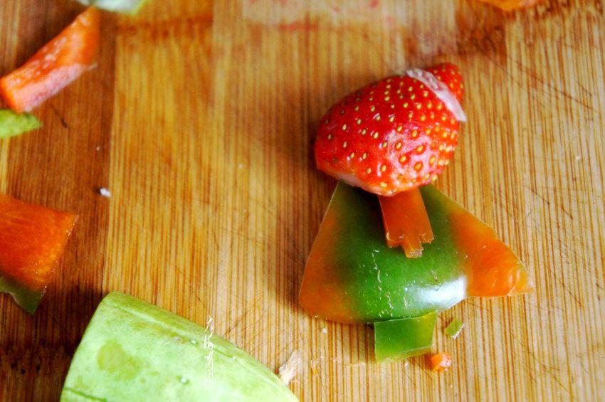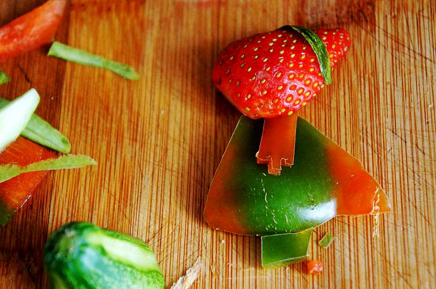 2、草莓还是要淡盐水浸泡5~10分钟,然后反复冲干净,用厨房纸吸净水分,取一个草莓切片做萌娃草帽,用黄瓜瓤切条做帽与沿的区分。洗净的青椒用厨房纸吸净水分,切片做萌娃衣服,刚好有红色和绿色搭配,取红色部分做萌娃胳膊,这样小萌娃就做完了。