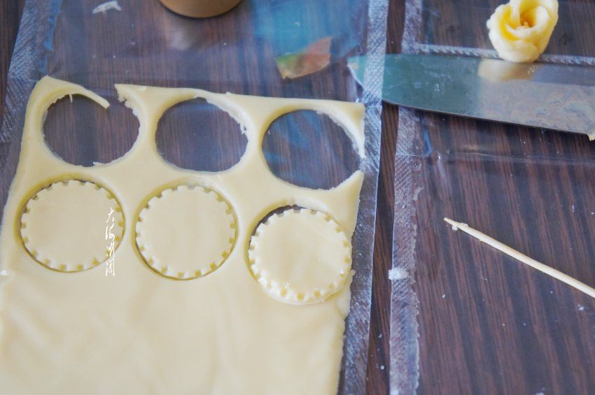 5、取一片芝士,用瓶盖压出圆形,三片卷在一起成玫瑰花,中间切开变成两朵玫瑰花。