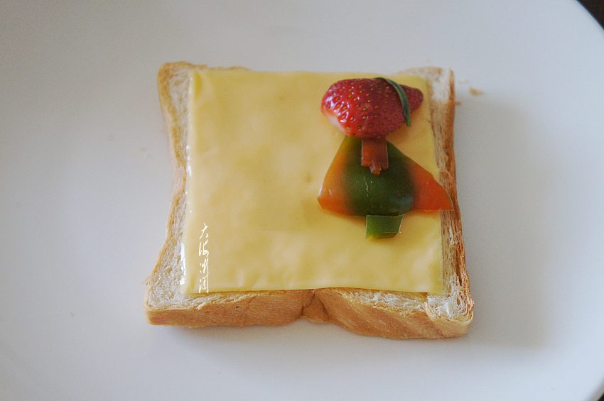6、面包片铺在盘子中,放上一片芝士,放上做好的萌娃。