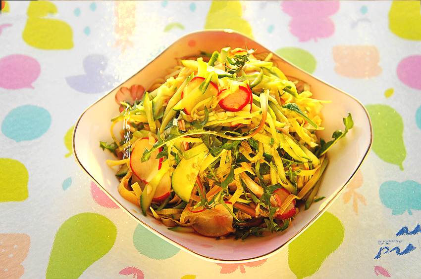 今天这道凉拌菜可谓是夏日的一道小清新,除了家常凉拌菜必须的食材,还加了来自大山里的蒲公英,东北人都叫它婆婆丁,鲜嫩爽口,微苦,搭配其他食材,再加上调味料一拌就没有苦味了。蒲公英是一种高营养的绿色健康保健食品,可生食或炒食、做汤、凉拌均可。蒲公英植物体中含有蒲公英醇、蒲公英素、胆碱、有机酸、菊糖等多种健康营养成分,而且蒲公英以全草入药,有清热解毒、消痛散结之功效。夏季是阳气最盛的季节,特点是燥热,"热"以"凉"克之,"适当吃些凉性的食物,有利于生津止渴,除烦解暑,清热去火,排毒通便。夏天汗多容易伤阴,饮食应以清淡、苦寒、营养丰富、易消化的食物为佳。一日三餐中,除了荤菜之外,烹饪一两道色彩清新、爽口开胃、营养丰富的凉拌菜,不但能增进食欲,还能补充多汗流失的水分,保持身体健康之需。