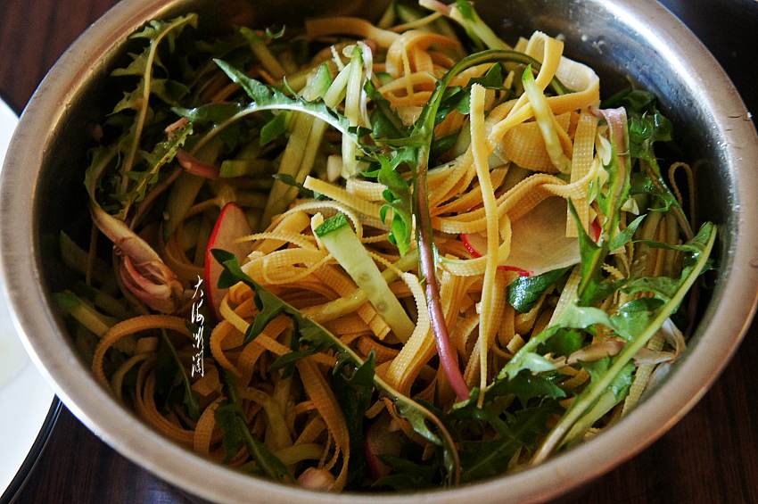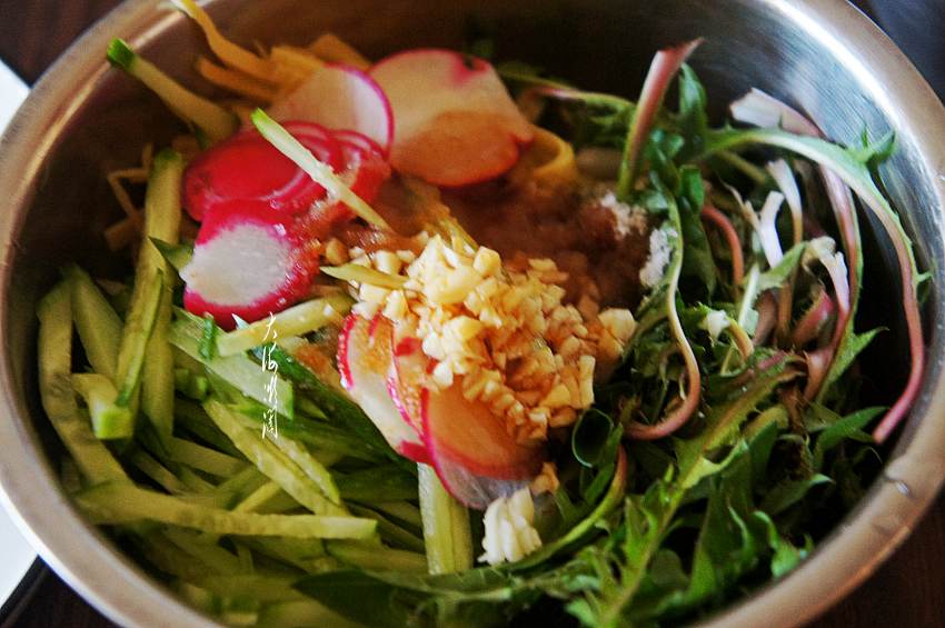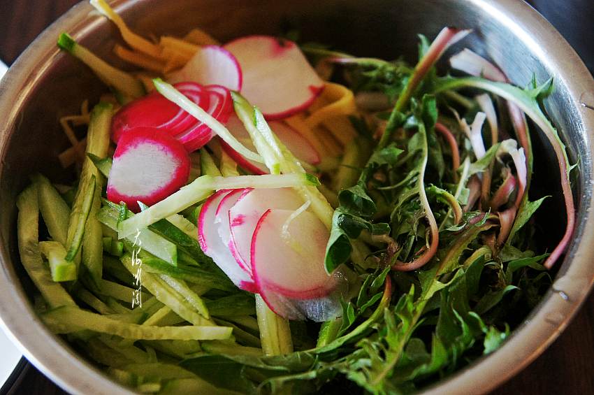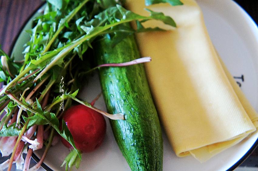做法及步骤:1、蒲公英去掉老根老叶,冷水浸泡半小时,反复洗净,控净水分备用。黄瓜、水萝卜淡盐水中浸泡10分钟,反复清洗干净备用。