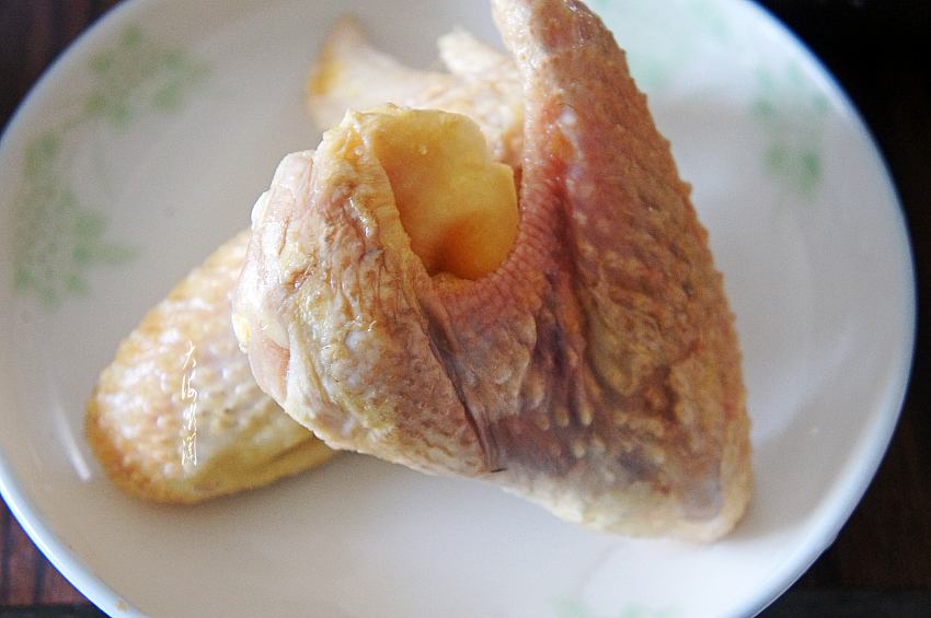 3、捞出鸡翅,将鸡翅在关节处斩成三节。