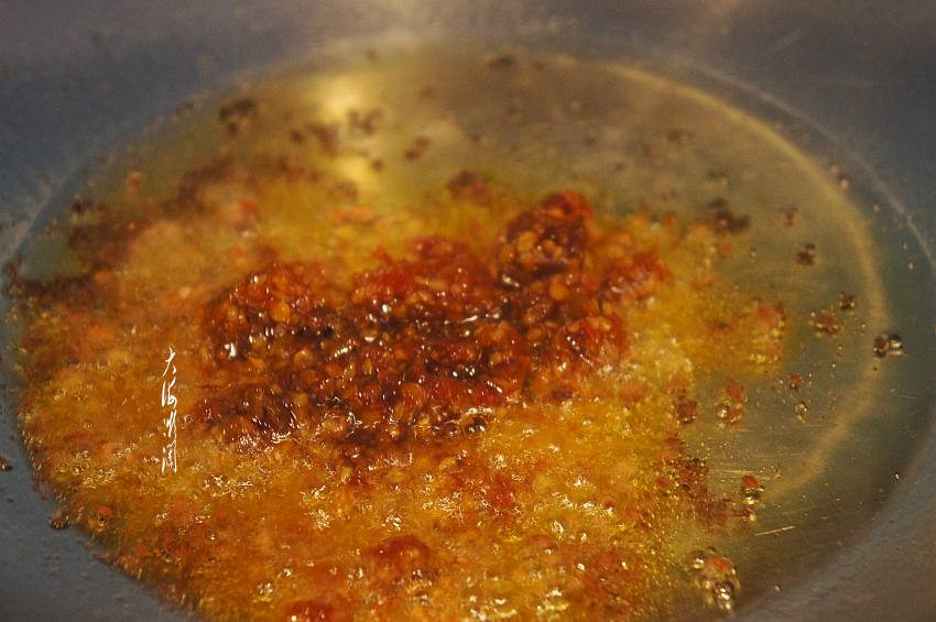 4、炒锅加入适量的油,爆香辣椒酱,这辣椒酱滋味很丰富,其中除了辣椒和豆瓣酱,还有芝麻、大蒜、白糖和花生以及菜籽油等,这些食材合在一起熬制的辣椒酱,味道超棒,作为调味料凉拌热炒都好吃。