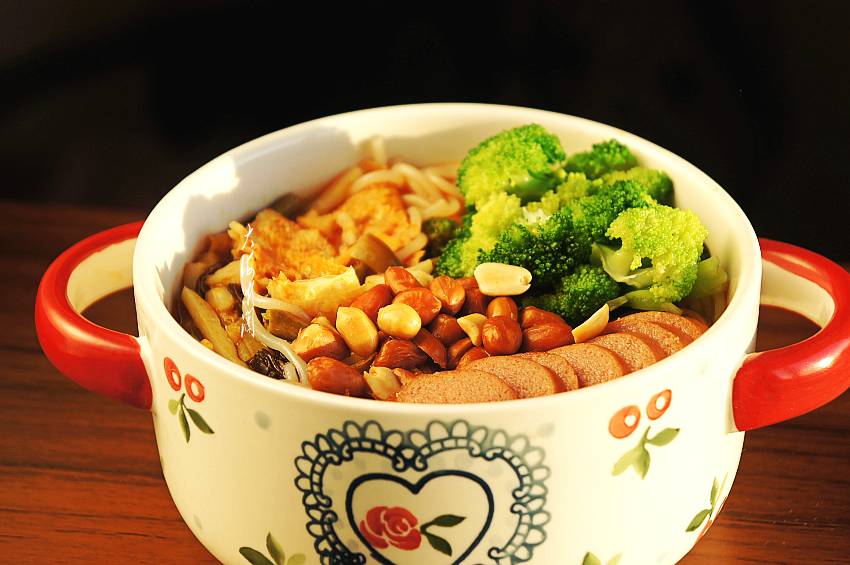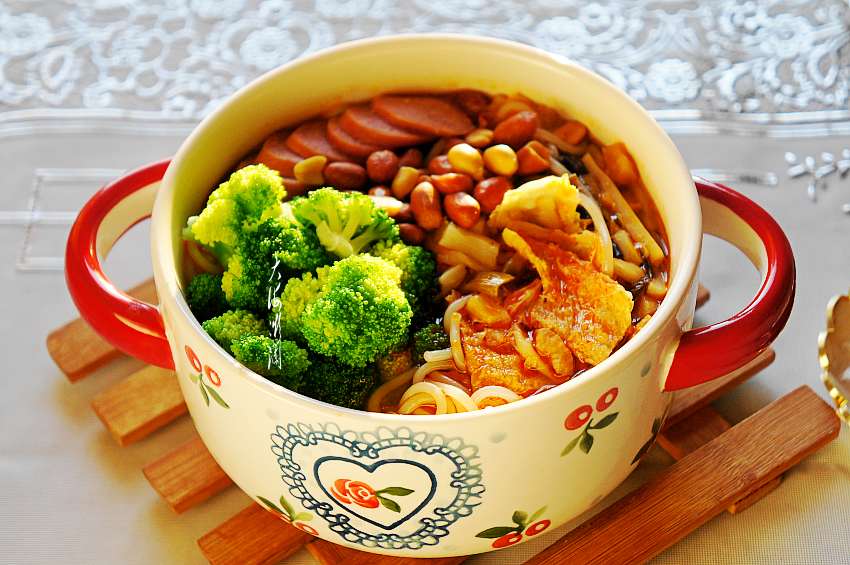8、取略大一点的碗,倒入煮好的螺蛳粉,牛肉肠切片码在上边,码入西兰花,倒入花生米就OK啦!