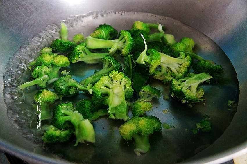 3、再添加一点绿色,让这碗螺蛳粉更迷人。西兰花淡盐水中浸泡10分钟以上,再反复清洗干净,锅中加入适量的水,滴几滴油焯烫西兰花,保持颜色碧绿,过冷水捞出控净水分。