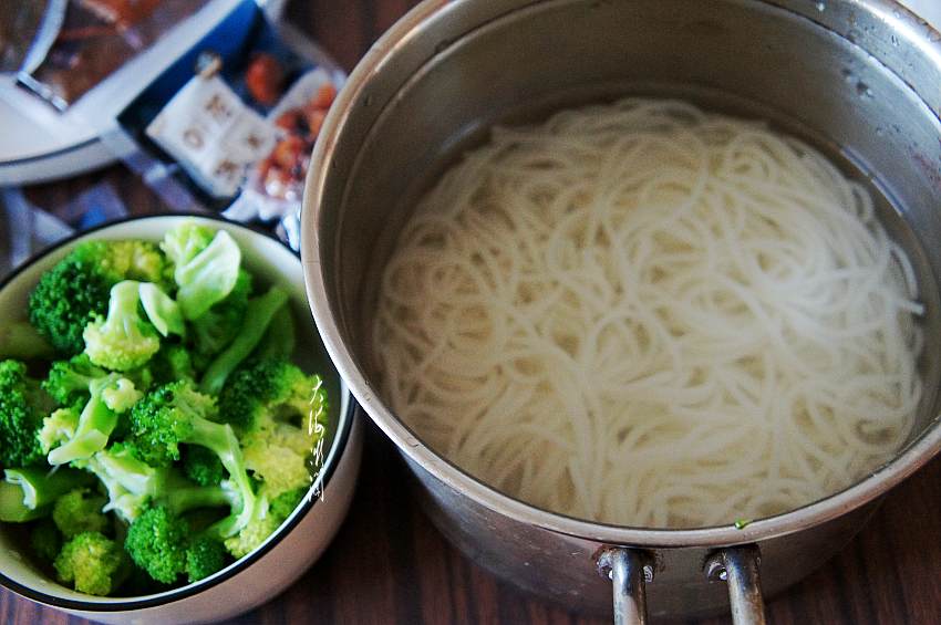 5、煮好的米粉过冷水捞出控净水分备用,西兰花捞出控净水分备用。