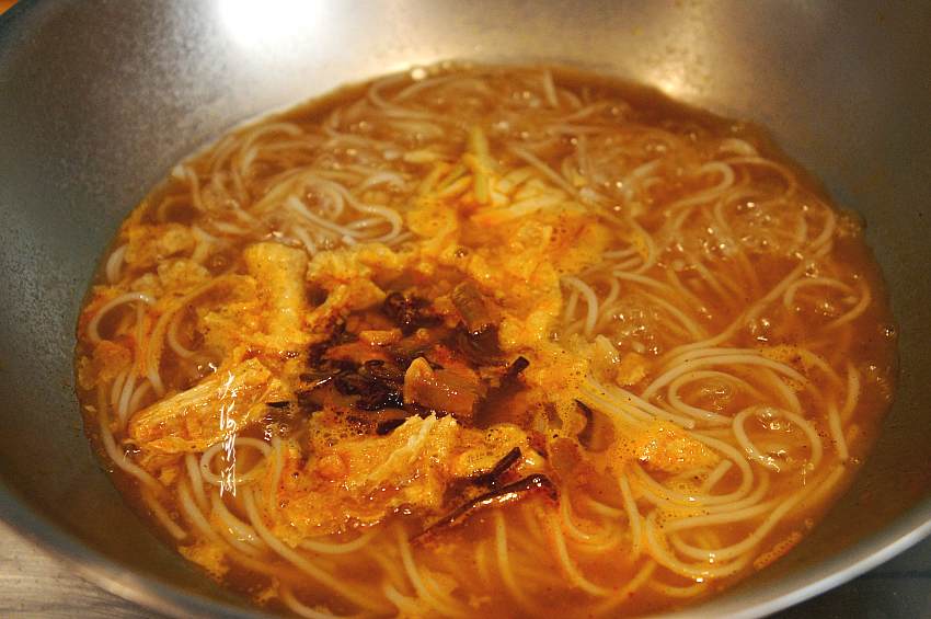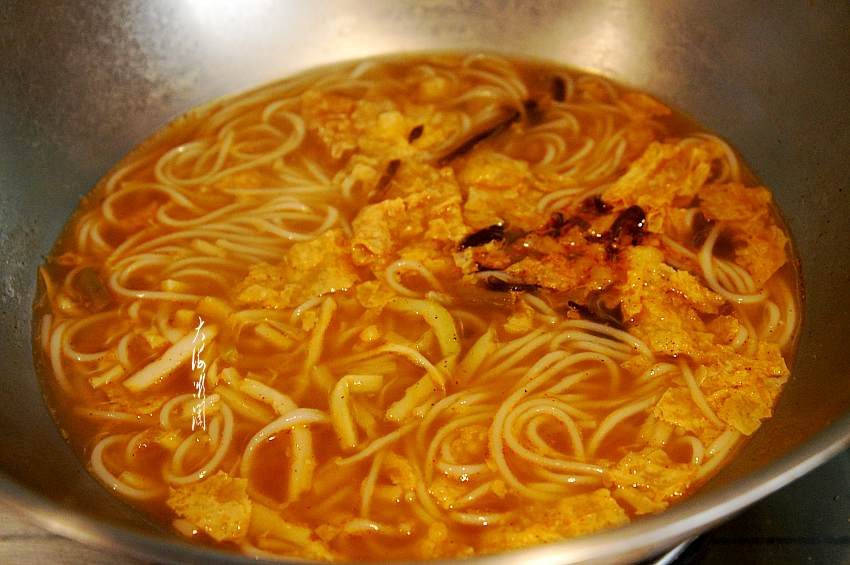 6、锅中加入适量的水,下入螺蛳汤料和煮好的米粉,煮1分钟,下入除了花生米之外的其他各种配菜。