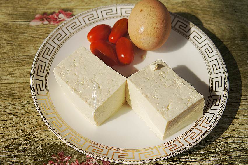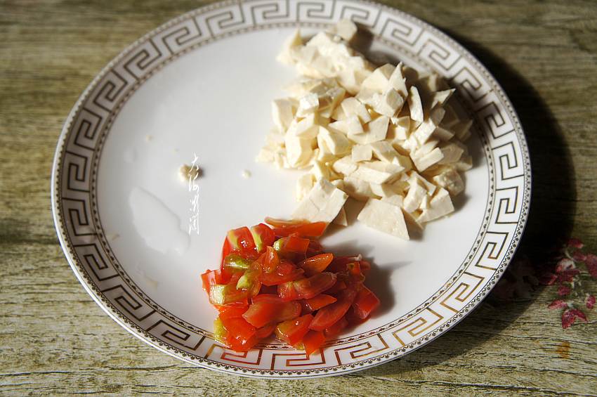 2、水豆腐冲洗干净,切丁。圣女果切丁备用。