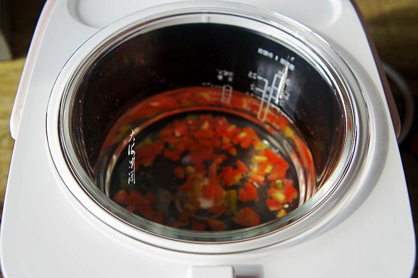 3、玻璃内胆加入1杯米的用水量,撒入番茄丁。