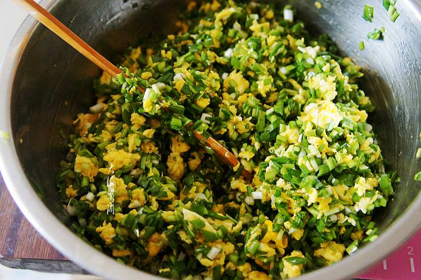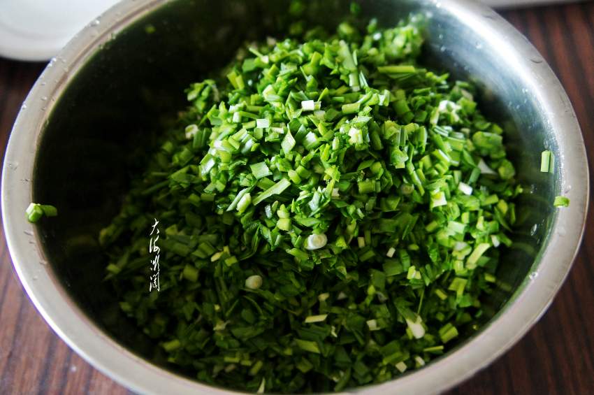 3、切碎,这韭菜比市场买来的韭菜要干爽的多,倒入少许油拌匀锁住水分。