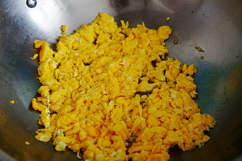 5、炒锅加入适量多一点的油,拌馅时不用另加油了。油开倒入蛋液,迅速用筷子搅拌,越碎越好,然后取出备用。