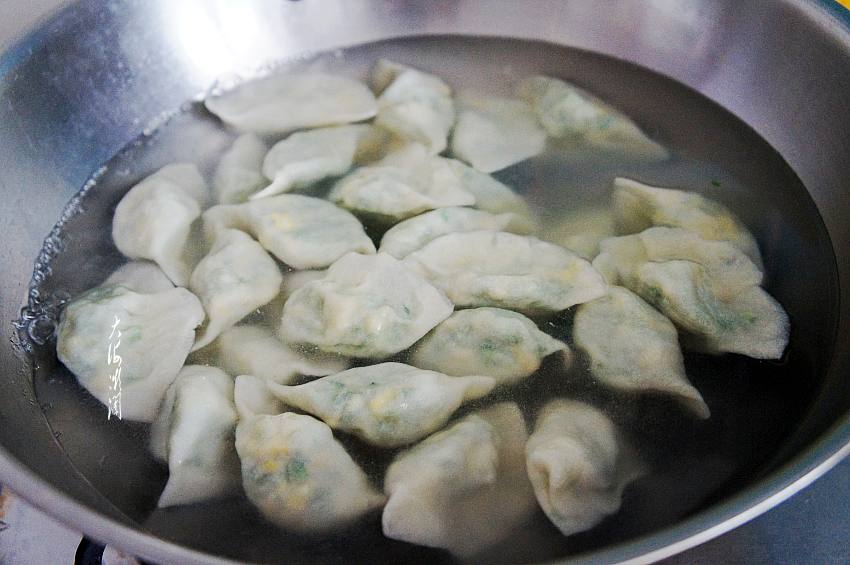 9、煮饺子:锅中加入适量的水,水开下入饺子,煮开浇点冷水,再煮开再浇点冷水,第三次煮开关火,捞出,饺子煮的恰到好处。