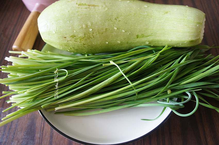 2、西葫芦洗净,西葫芦是大庆的外甥女带来自家种植的西葫芦,长相不标准,确是纯绿色食材。野韭菜是从野山采摘回来的,同样是绿色食材,摘洗干净,控净水分。
