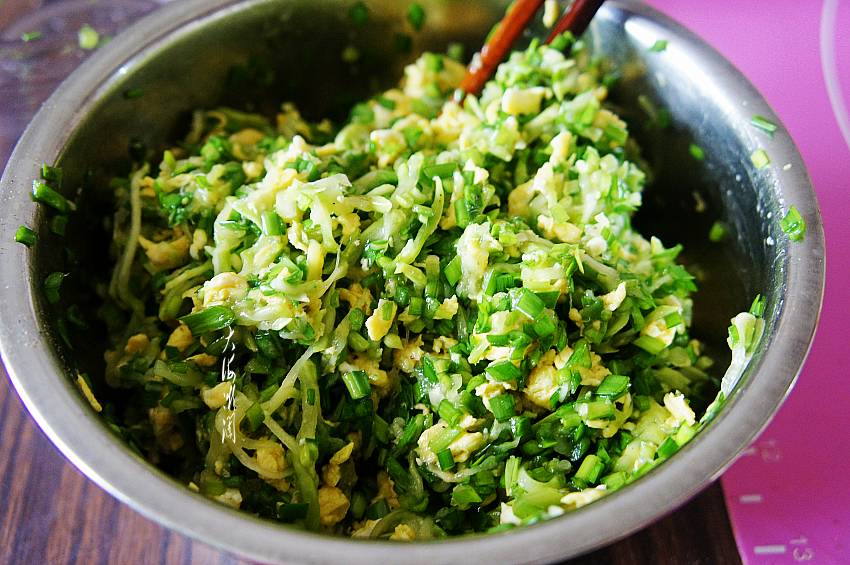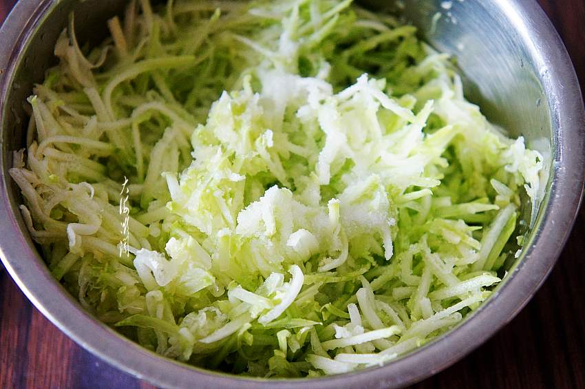 2、西葫芦水分大,需要用盐腌制一下,攥掉水分再拌馅。