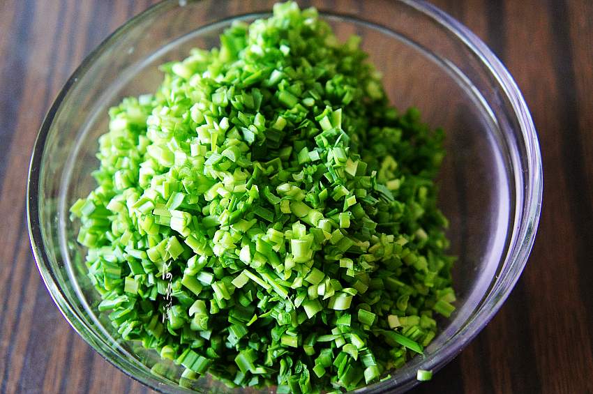 5、韭菜切碎,加少许油拌匀,锁住水分。