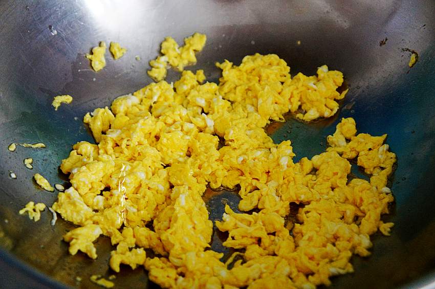 6、鸡蛋打散,锅中加入适量多一点油,拌馅时不另加油了。油开倒入蛋液,迅速用筷子搅拌,越碎越好,然后取出备用。