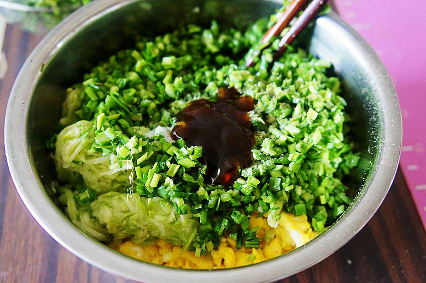 【韭菜西葫芦鸡蛋馅蒸饺】所需食材:高筋粉300g;西葫芦半个;鸡蛋3个;野韭菜1小把;油适量;盐适量;五香粉适量;胡椒粉适量;蚝油适量。