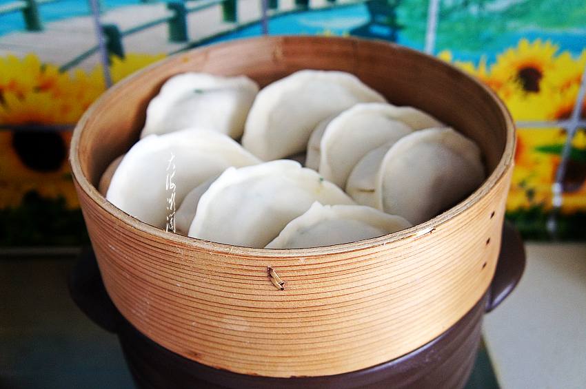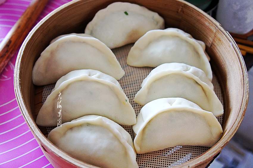 10、包好的蒸饺码入蒸屉。