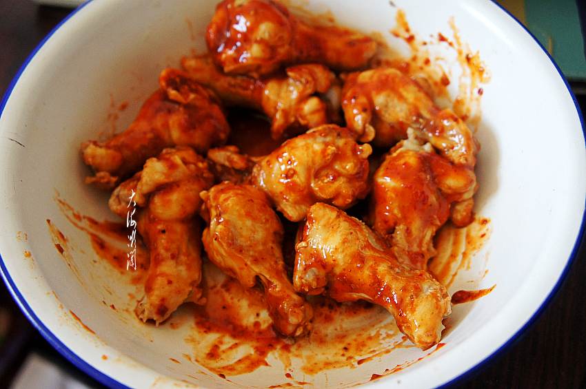 3、煮好的鸡翅根捞出,控净水分,倒入香辣烧烤酱腌制20分钟左右。