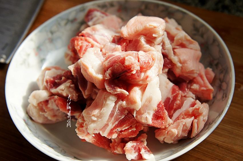 3、切好的肉块用冷水浸泡出血水,大约半小时左右,再反复清洗干净,这种做法是不焯水,所以一定要泡出血水,中间注意换2次水。今天买这肉比较新鲜,基本没有血水。