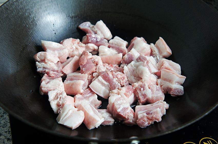 4、炒锅无需加油,小火慢慢加热,倒入洗干净的五花肉,小火慢慢的翻炒至出油。