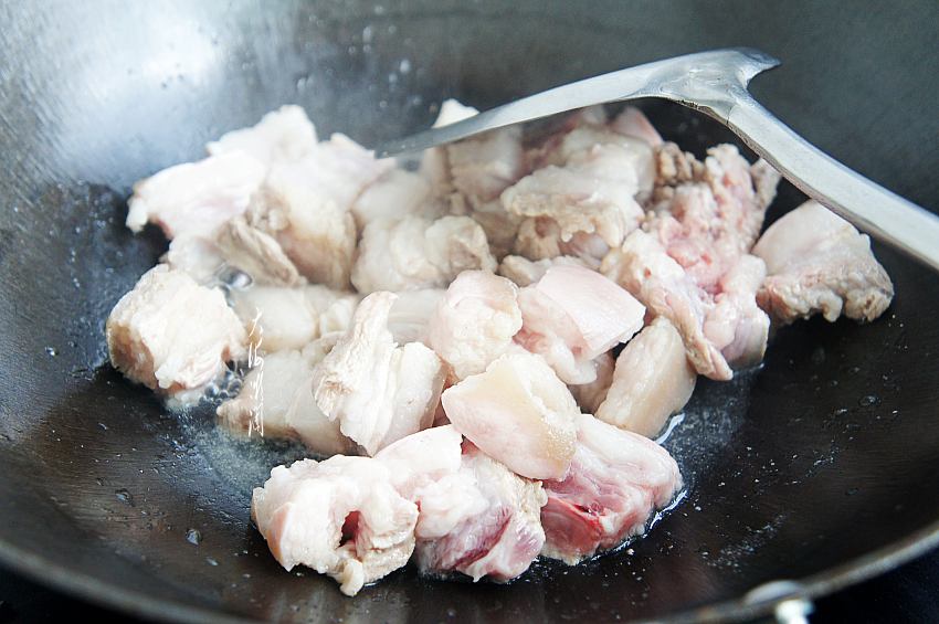 2、由于五花肉本身就带有一些油质,所以在炒肉时不需要再放油了,只需将火力调小,肉里的油质就能慢慢被逼出,这样做出来的红烧肉不会油腻。