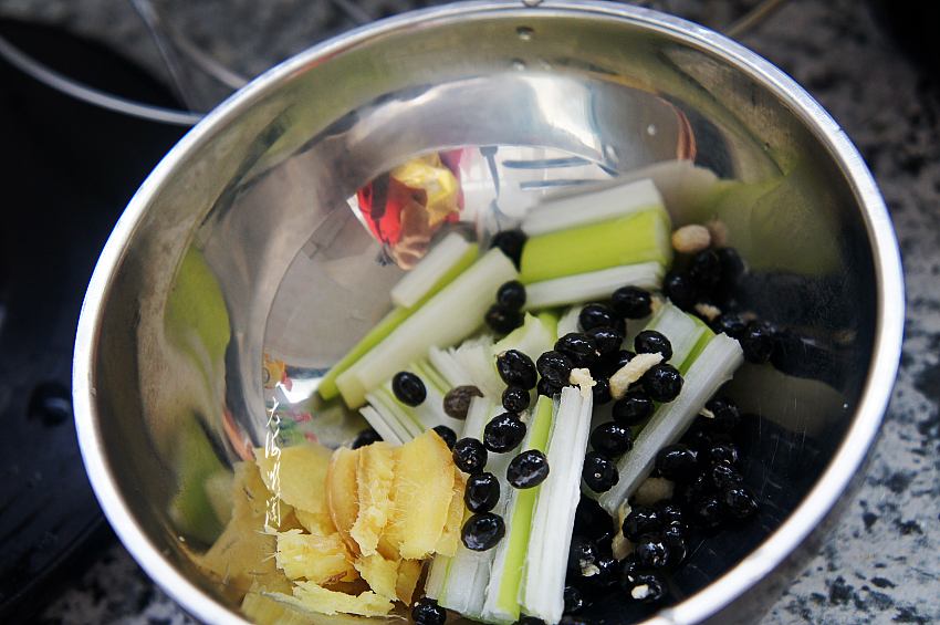 6、葱去皮洗净切段,姜去皮洗净切片;花椒大料过水冲洗干净,黑色的是木瓜籽,