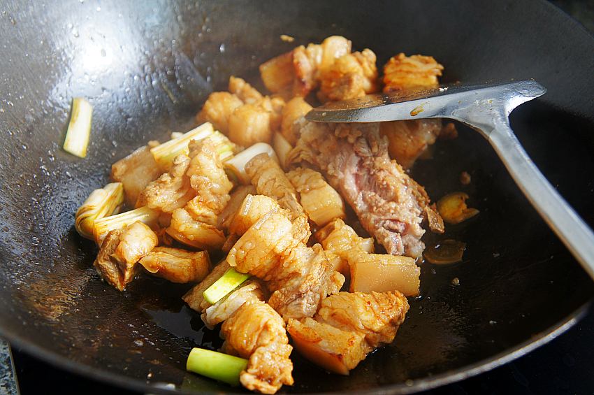 5、炒至肥肉出油,会出来很多油的,油炒出来再炖就不会肥腻了。